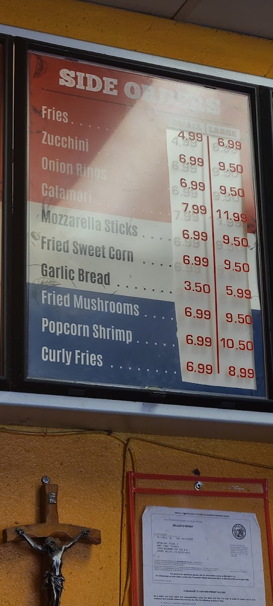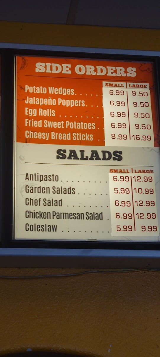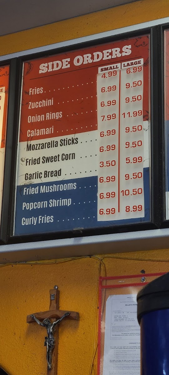 Side orders consist of popular items like fries, zucchini, onion rings, calamari, mozzarella sticks, sweet potato fries, garlic bread, fried mushrooms, and various types of fries including curly and potato wedges. Additional side options include popcorn shrimp, shrimp, jalapeño poppers, egg rolls, cheese bread sticks, chicken wings, and chicken strips.